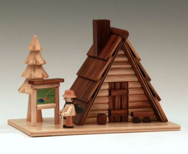 handgeschnitzter Baum und kleine Sitzbank vor der Hütte.