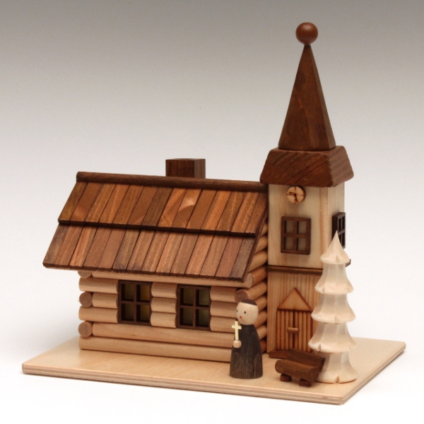 Dorfkirche als Massivholz-Blockhütte mit erzgebirgischem Holzschindeldach, Glockenturm und Schornstein,